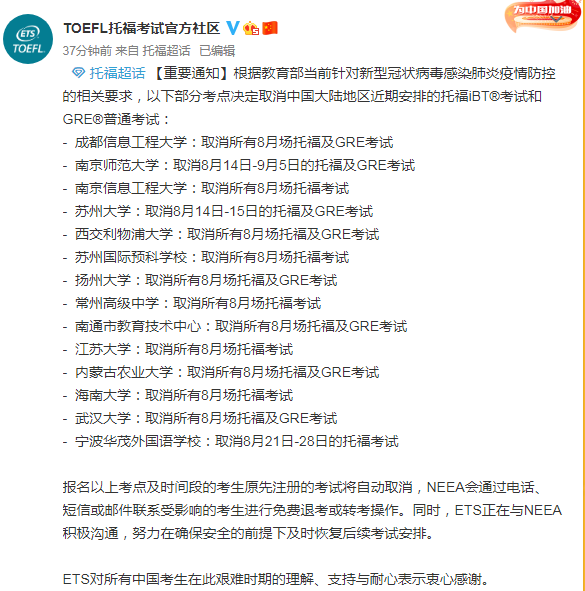 - 南通市教育技术中心:取消所有8月场托福考试