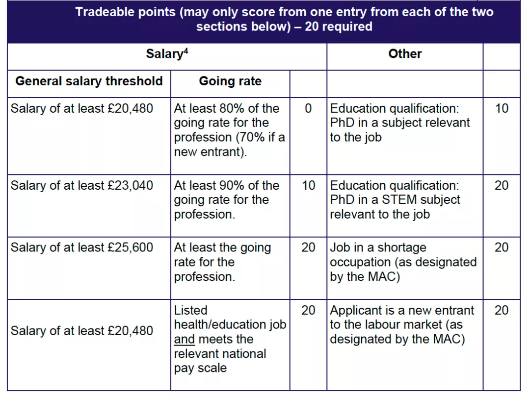另外申请人薪资如高于25,600英镑,即可获得额外20分。如低于此工资水平,则需考量以下条件是否满足,而获得20分的加分: