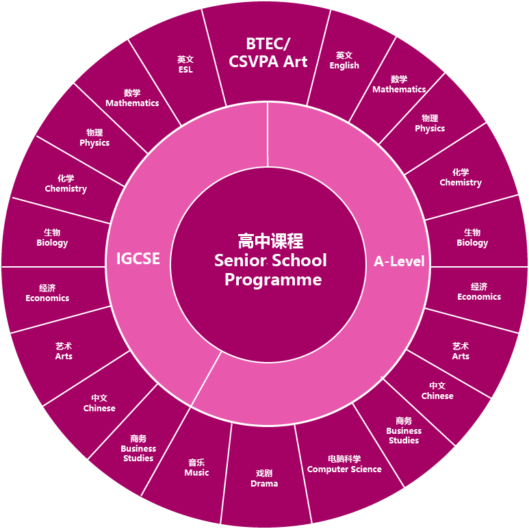 高中部为学生提供 IGCSE、A-Level课程,并提供雅思等语言考试培训课程,让学生无缝衔接进入世界名校深造。我校同时开设BTEC课程和剑桥艺术联合书院,为9年级及以上的中学生提供完善的艺术专长课程,助力学生冲刺海外艺术名校。