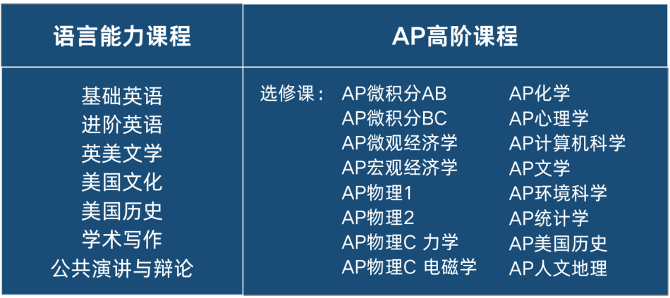 侨中国际设有13-16门AP选修课程,如AP微积分AB、AP微积分BC、AP微观经济学、AP宏观经济学、AP物理1、AP物理2、AP物理C力学、AP物理C电磁学、AP化学、AP心理学、AP计算机科学、AP文学、AP环境科学、AP统计学、AP美国历史、AP人文地理。
