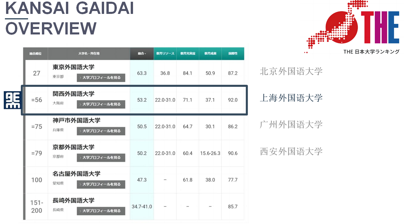 另外,在日本国内大学排名中,位于第56名,高于关西大学的排名。与GMARCH高校排名差不多。学生在校人数超过12000人,是日本最大的外国语大学,外国教师比例占比超过37.9%,位于日本全国第3名。
