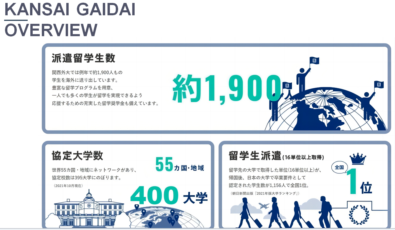 关西外国语大学每年会派遣约2000名学生到海外进行留学,并与海外约400多所大学有合作关系。学校一共有4个校区,在专业方面,以语言学习+文商全科为特点,独创“文化区域、经营全球化、环旅可持续、创新亚洲”四大课程群。涵盖语言、文学、文化、教育、社会、经济、管理、贸易、区域发展、环境、旅游等广阔的学科领域,构建根植亚洲,具备全球化视野的新兴大文科专业,让学生能够拥有全方位多角度的跨学科思维模式,培养学生发现问题、分析问题、解决问题的能力。