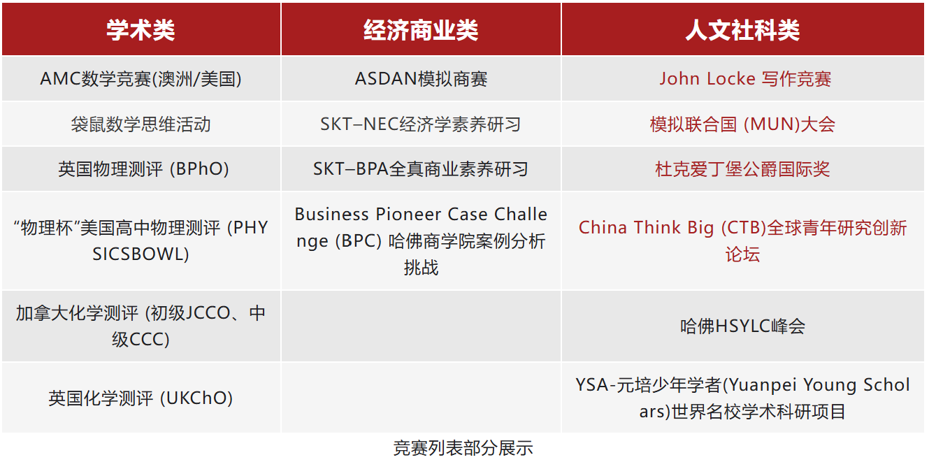 雅思、选修、社团、活动、学术辅导、竞赛辅导常态化轮转开展;每周一提供雅思辅导;根据学习进度的不同提供学术支持;竞赛辅导分为基础指导、阶段性训练和专项训练。
