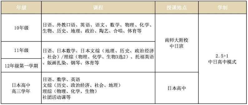 国际部中日班创办于2017年,是华东地区成立时间较早、办学经验丰富的中日国际课程班,连续第9年招生。不同于传统的中日班,我校中日项目是日本文部省注册,以中日基础教育课程对比研究为中心、在国内学习阶段直接引进日本留考课程以及日本学业评价体系;是向中国学生和国际学生提供中日融合课程的、具有独特创新模式的国际教育项目。