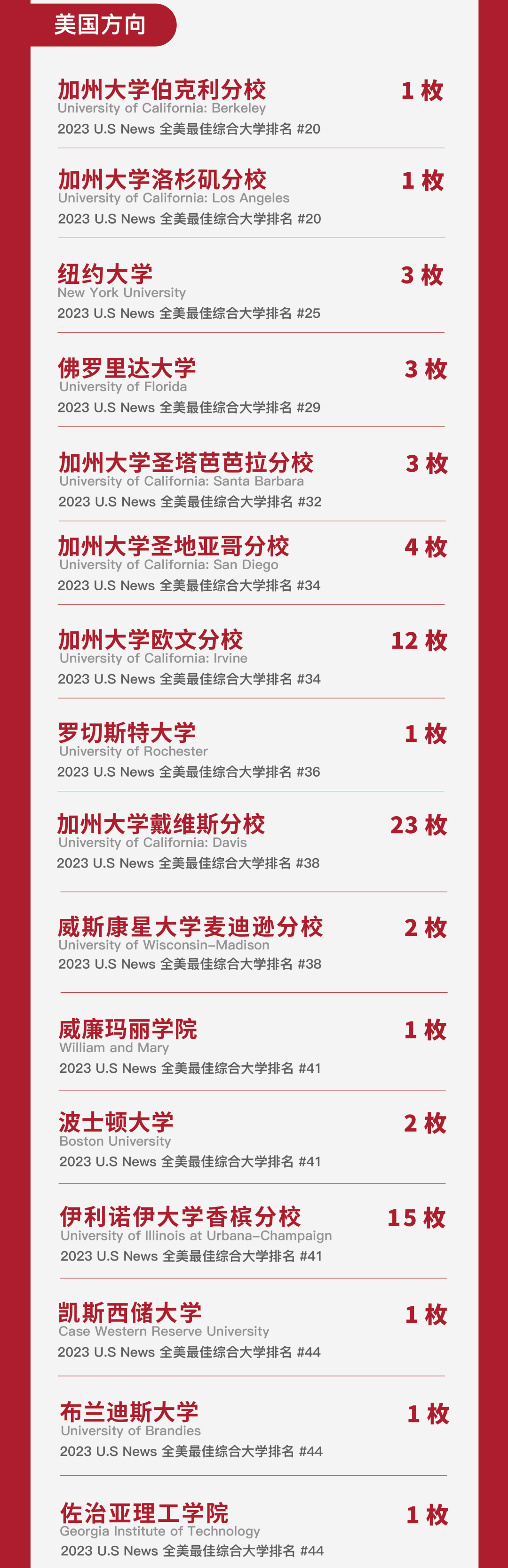 美国方向:收获加州大学伯克利分校、加州大学洛杉矶分校、纽约大学、佛罗里达大学、加州大学圣塔芭芭拉分校、加州大学欧文分校、加州大学圣地亚哥分校、罗切斯特大学、加州大学戴维斯分校、威斯康星大学麦迪逊分校、威廉玛丽学院、波士顿大学、伊利诺伊大学香槟分校、佐治亚理工学院、华盛顿大学、罗格斯大学等录取offer;