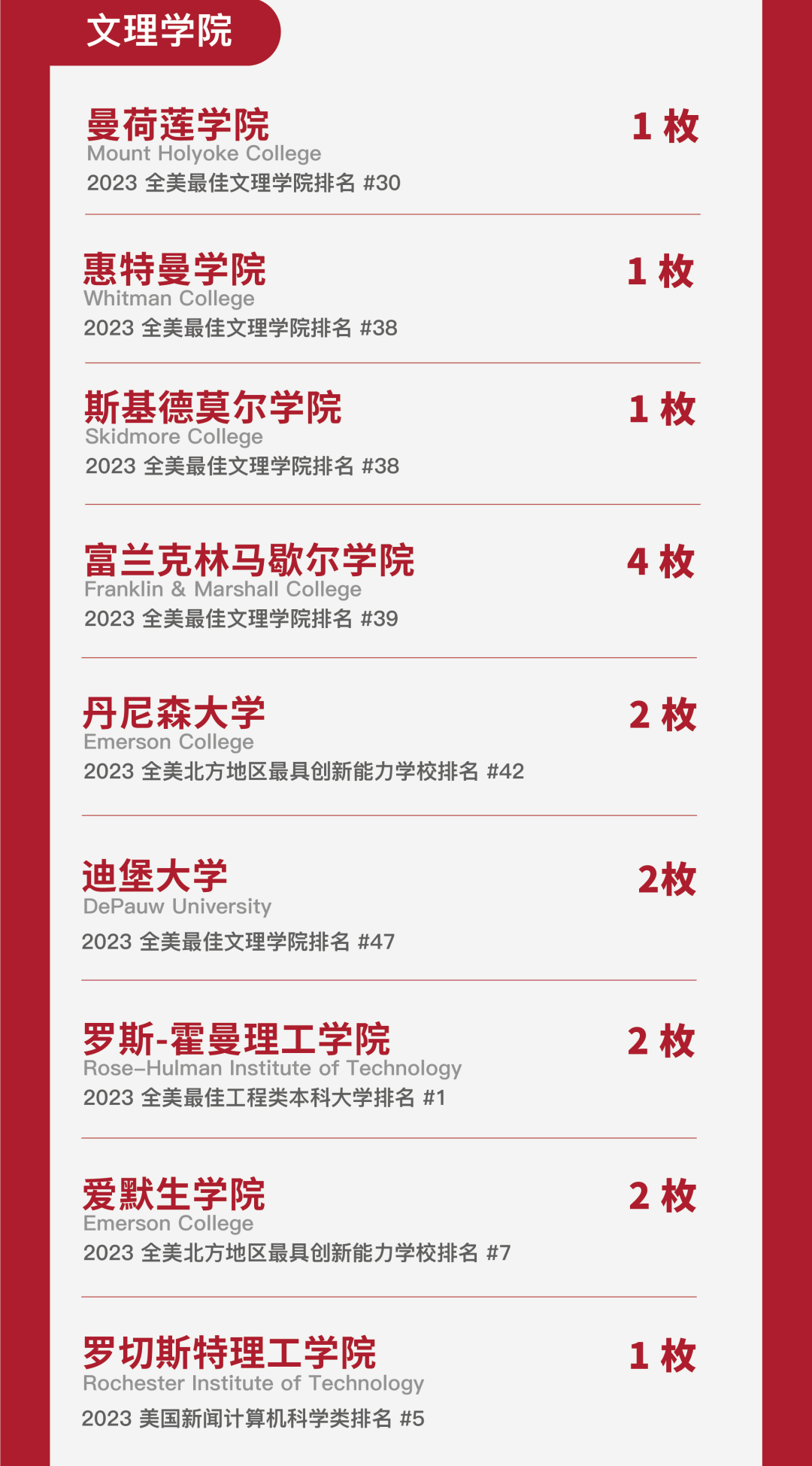 文理学院方向:收获曼荷莲学院、惠特曼学院、斯基德莫尔学院、富兰克林马歇尔学院、丹尼森大学、迪堡大学、罗斯-霍曼理工学院、罗切斯特理工学院、爱默生学院等录取offer;