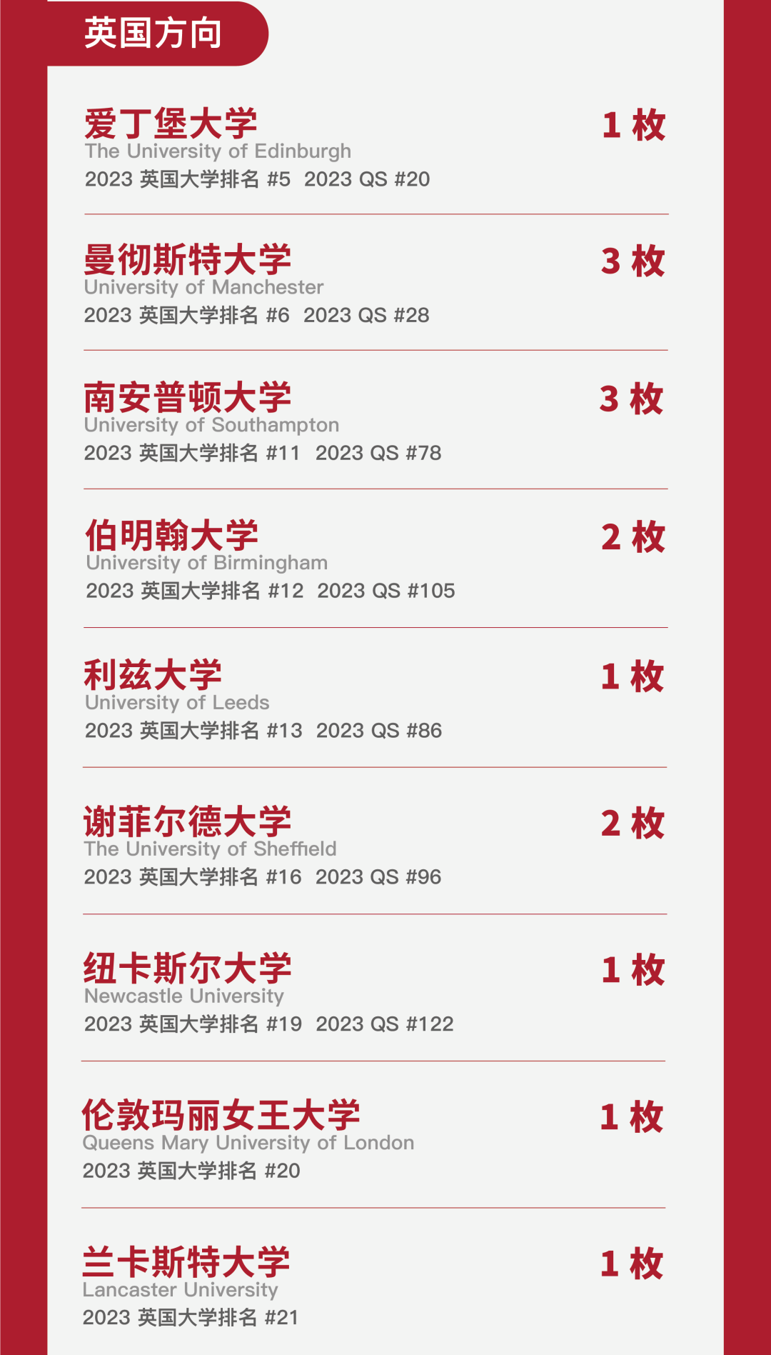 英国方向:收获爱丁堡大学、曼彻斯特大学、南安普顿大学、伯明翰大学、利兹大学、谢菲尔德大学、纽卡斯尔大学、伦敦玛丽女王大学、兰卡斯特大学等录取offer;