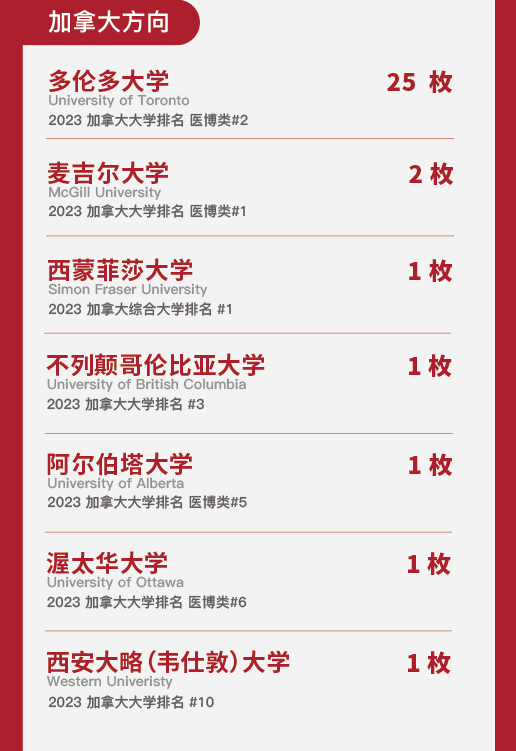 加拿大方向:收获麦吉尔大学、多伦多大学、不列颠哥伦比亚大学、阿尔伯塔大学、渥太华大学、西安大略大学、西蒙菲莎大学等录取offer;
