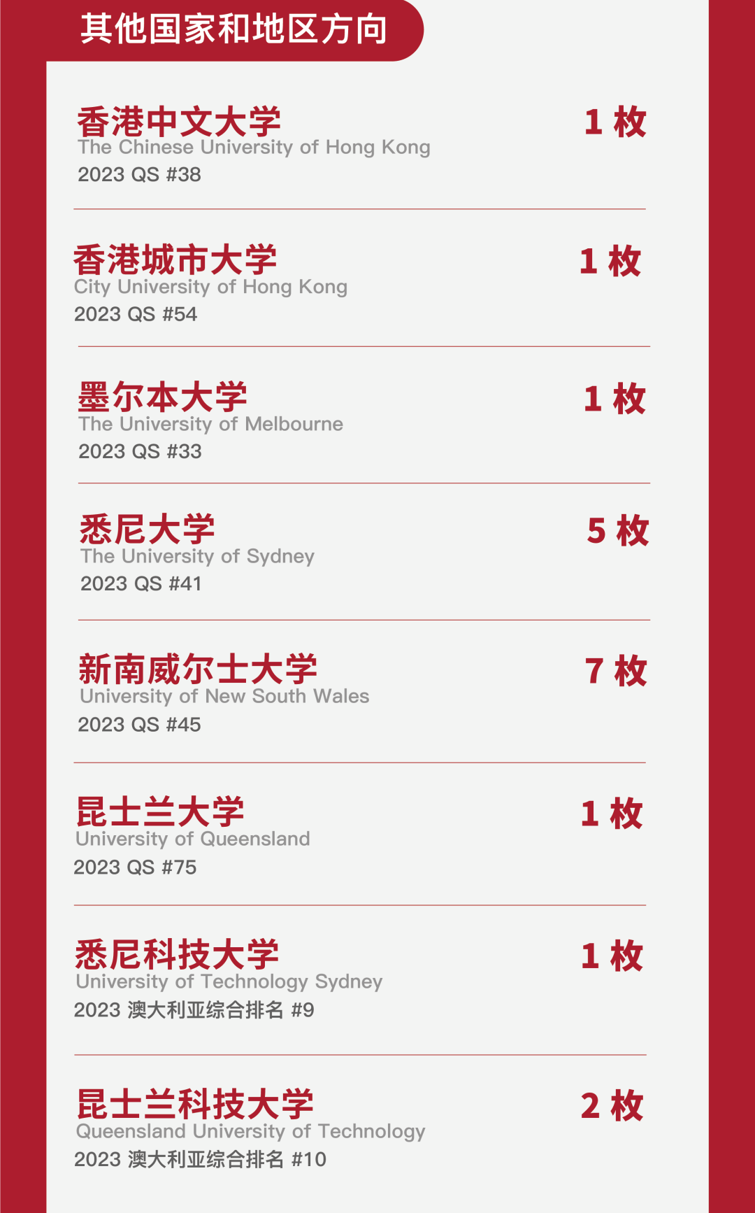 澳洲及其他国家方向:收获香港中文大学、香港城市大学、墨尔本大学、悉尼大学、新南威尔士大学、悉尼科技大学、昆士兰大学、昆士兰科技大学等录取offer;
