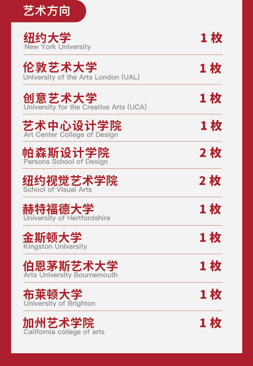 艺术方向:收获创意艺术大学、艺术中心设计学院、赫特福德大学、帕森斯设计学院、伦敦艺术大学、金斯顿大学、伯恩茅斯艺术大学、纽约视觉艺术学院、布莱顿大学、加州艺术学院等录取offer。