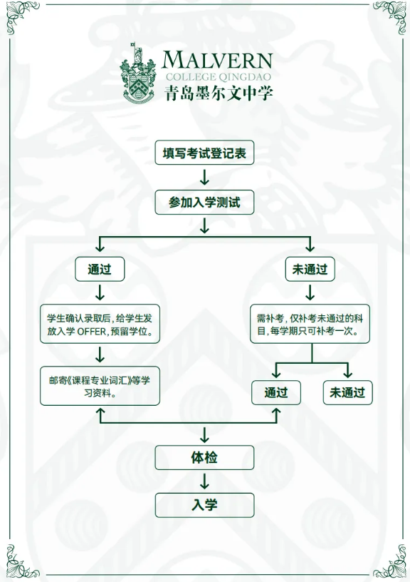 携带学生本人身份证件,参加由青岛墨尔文中学的统一入学测评,包括:英语机考、数学笔试、口语面试及家长面试。