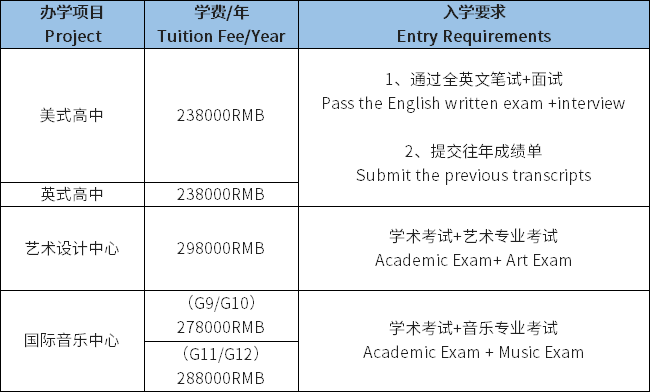 备注:学费包含资料费、学杂费、校服费、社团活动费、升学指导费、艺术作品集创作指导费(艺术设计中心),不包含餐费、住宿费、校车费、国际考试费、外出考察实践费等第三方收取的费用。