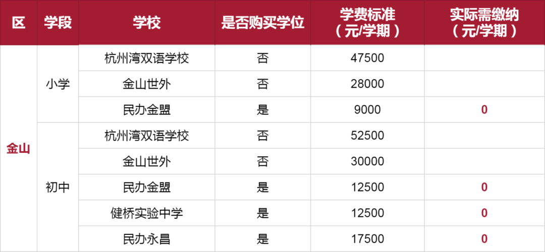金山区学费变化不大,3所学校被纳入政府购买学位,全部“0元入读”。