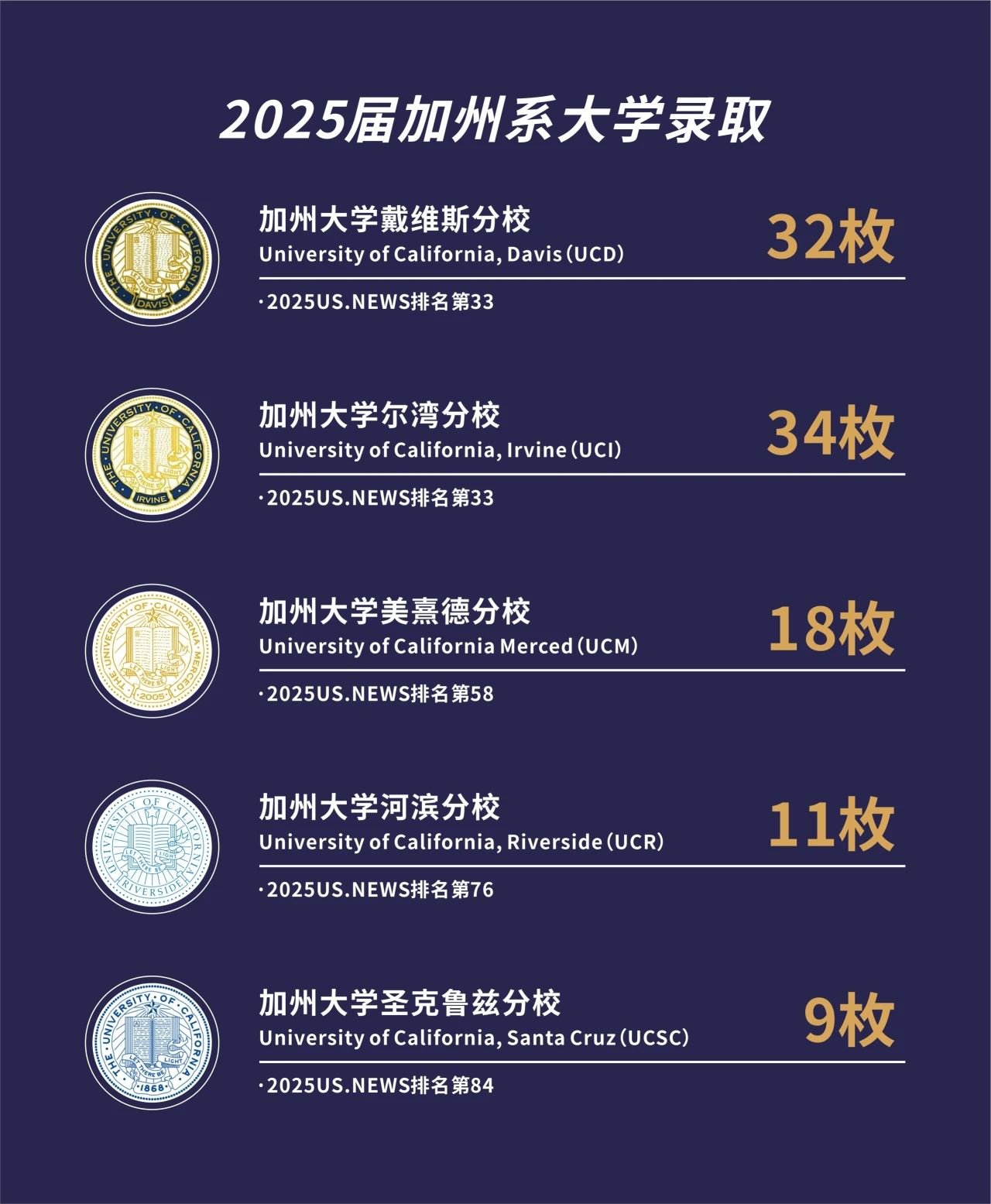 美国方向: 佛罗里大学1枚,加州戴维斯5枚,加州欧文3枚,纽约大学1枚,华盛顿大学1枚。