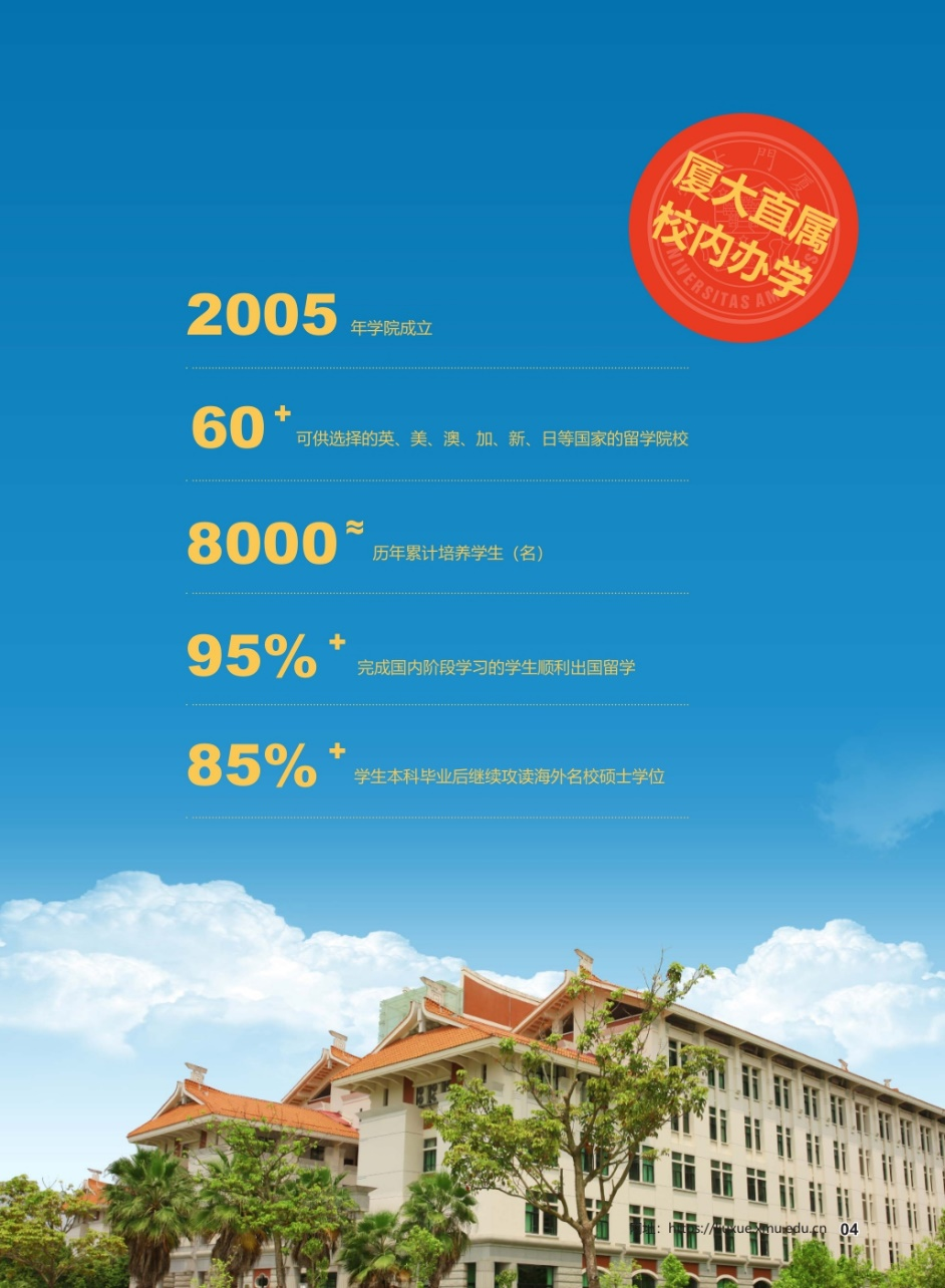 厦门大学国际学院位于厦门大学漳州校区,是直属学校领导的二级建制单位,是厦门大学专门从事出国留学教育的学院,也是福建省唯一经教育部留学服务中心授牌的出国留学培训基地。学院充分利用厦门大学完善的教学设施和优势学科资源,开设国际贸易与商务、国际理财、商务会计、市场营销等专业,与英国、美国、澳大利亚、新加坡、日本等国家的多所知名大学建立了长期、稳定的合作与交流关系,致力于国内外优质教育的衔接,助力学生“安全留学、健康留学、文明留学、成功留学”,为实现中国梦培养具有全球胜任力的人才。