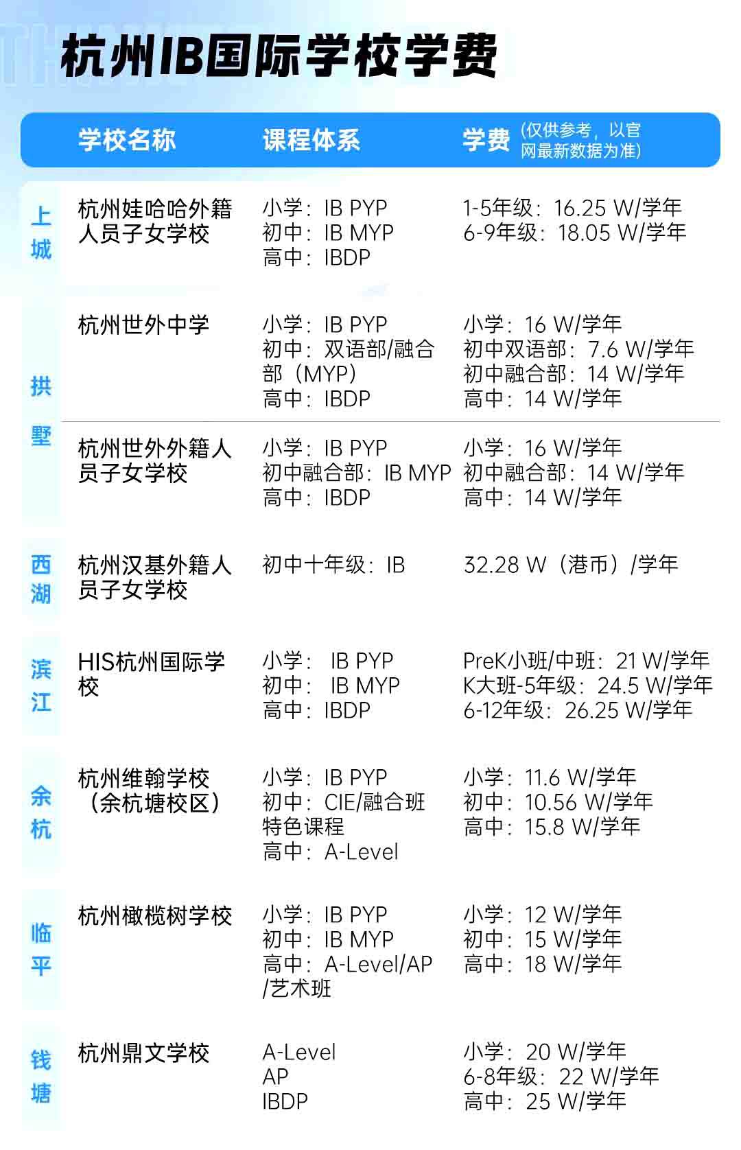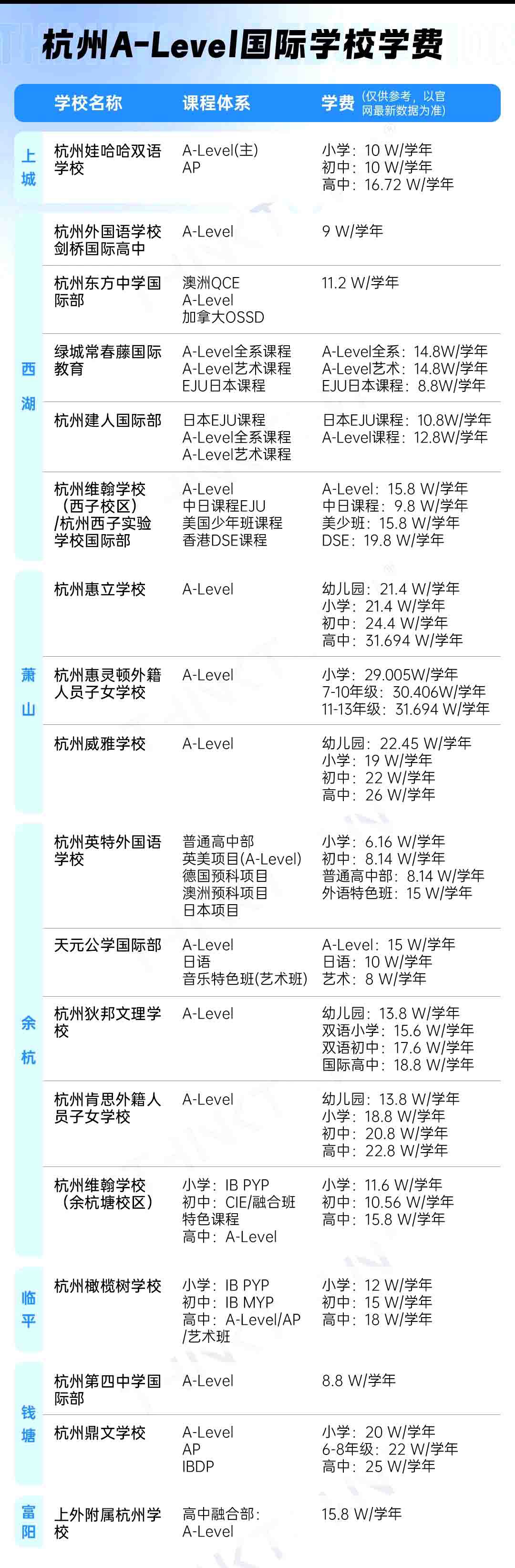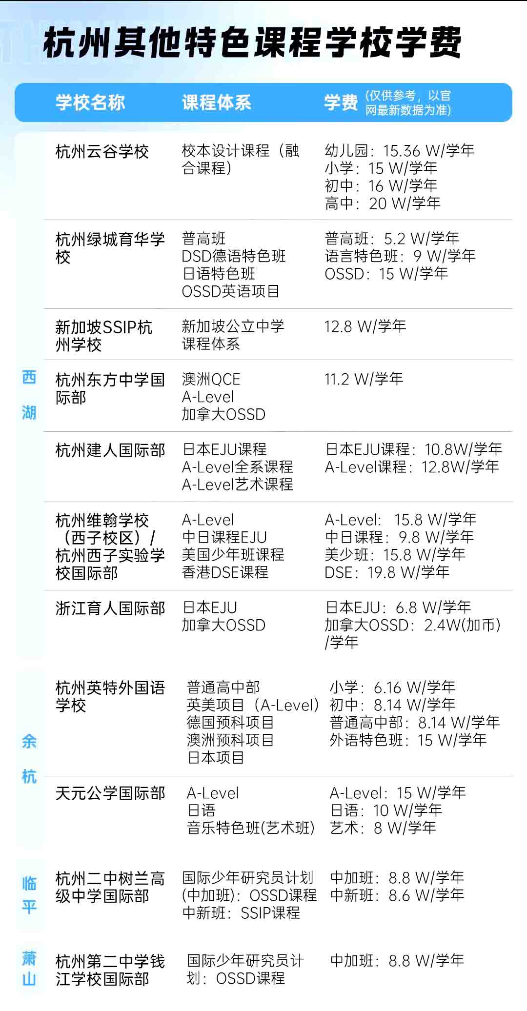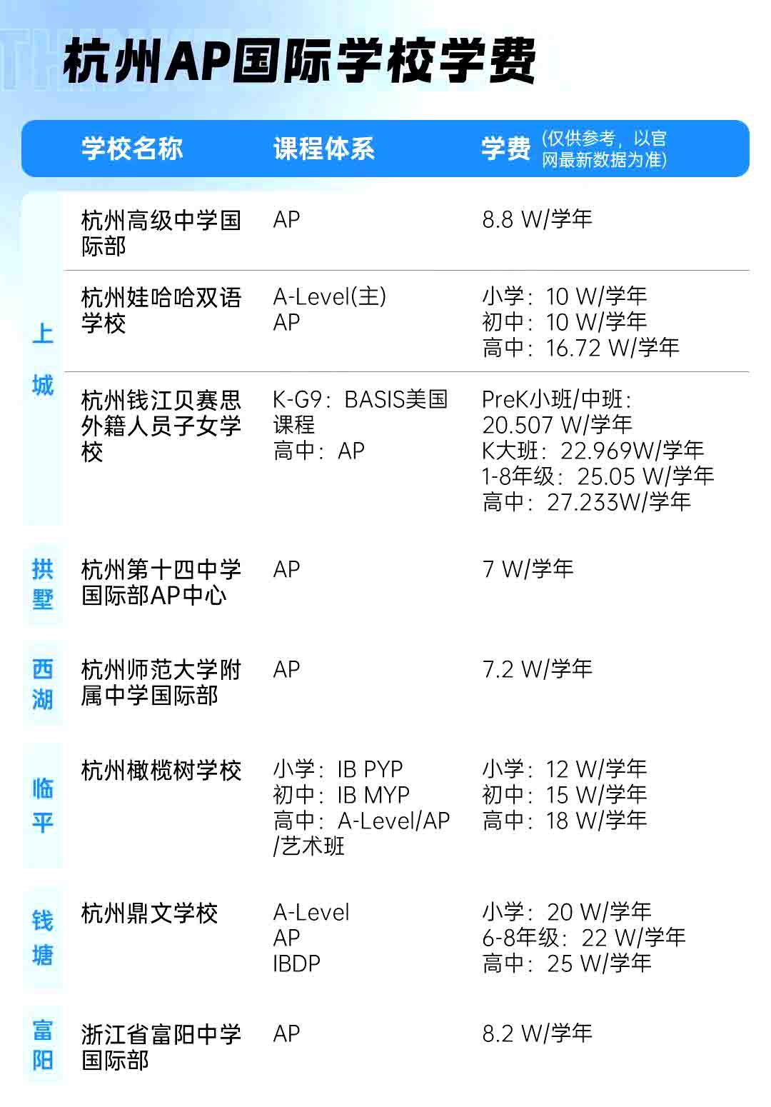 以上便是杭州国际学校在各区的分布情况,以及学校最新的学费数据。