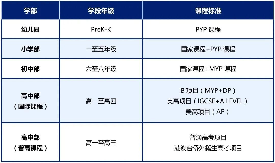 学校实施PYP、MYP、DP、IGCSE、A-level、AP等主流国际项目,融通中外教育精华,是教育部基础教育课程改革实验基地。