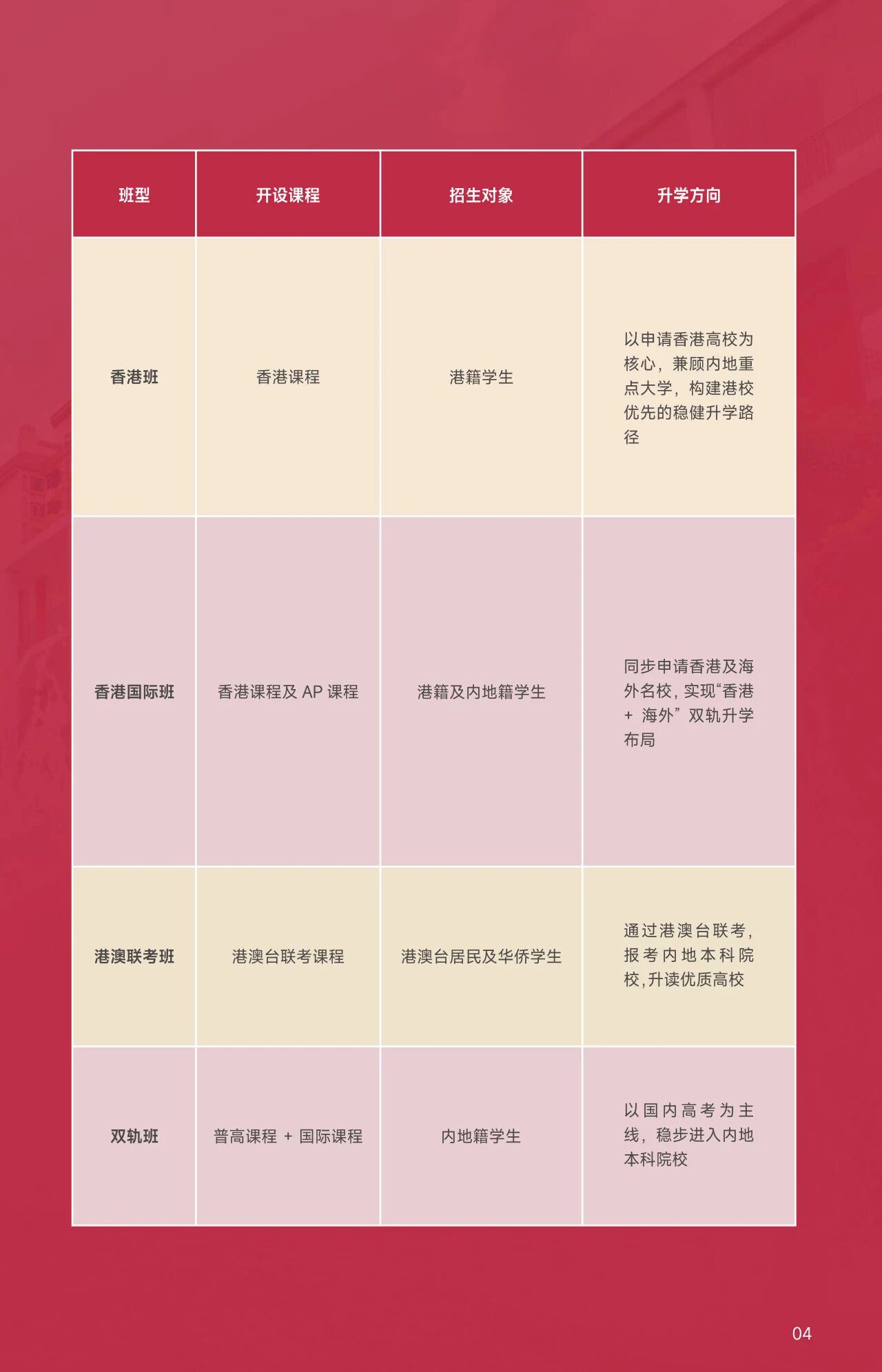 开设香港班、香港国际班、港澳联考班、普通高考班,满足不同升学规划。