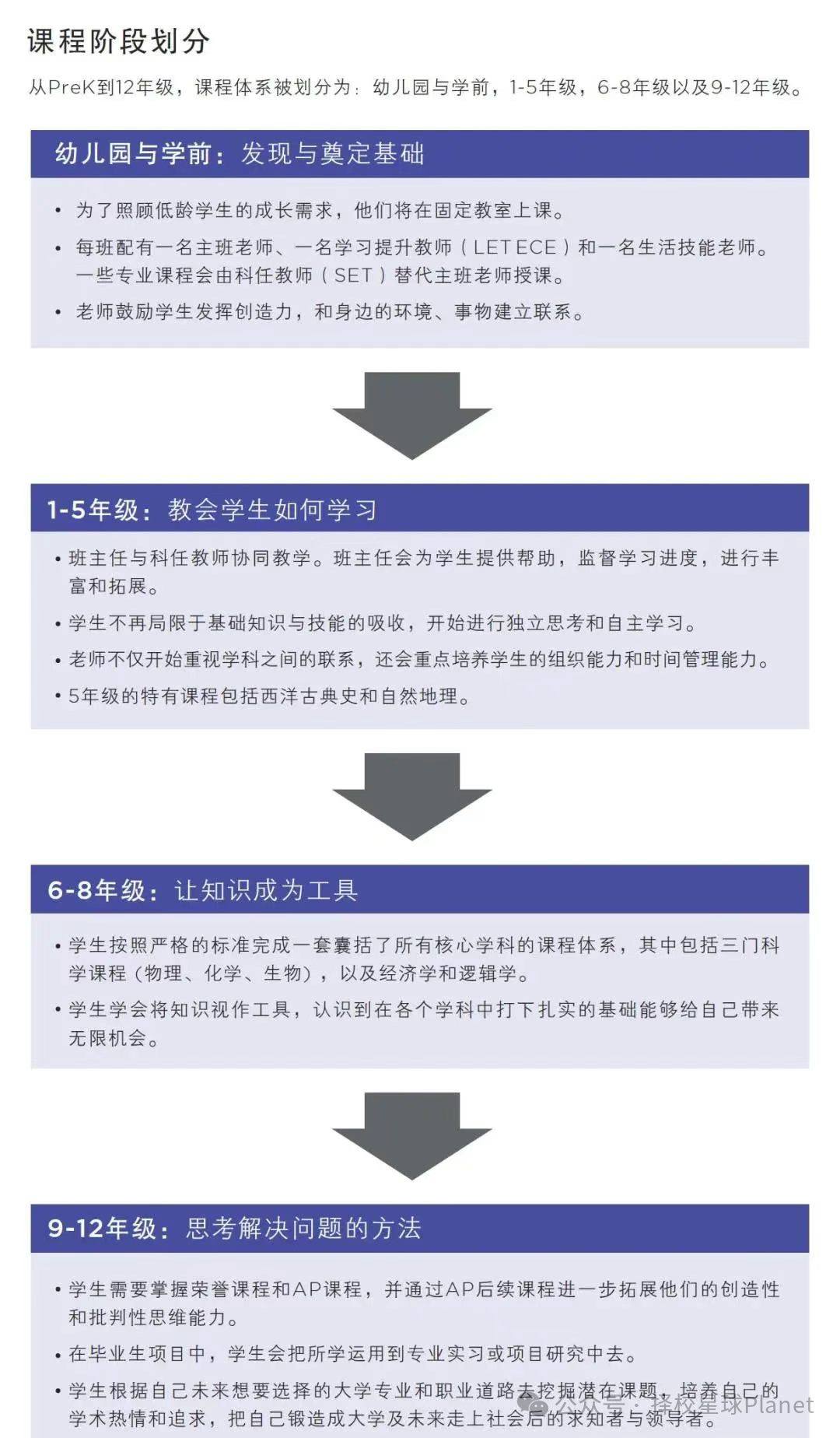 BASIS 实行STEM-focused Liberal Arts Program课程体系,即在重视STEM(科学、技术、工程、数学)学科学习的基础上,平衡发展、文理兼修的教学体系。其独特的螺旋式教学方式,深受学生的喜爱,根据每个学生的具体情况有针对性的设计课程,强调严格、超前、加速的要求以提升学生的责任感、克服困难的能力和学习热情。