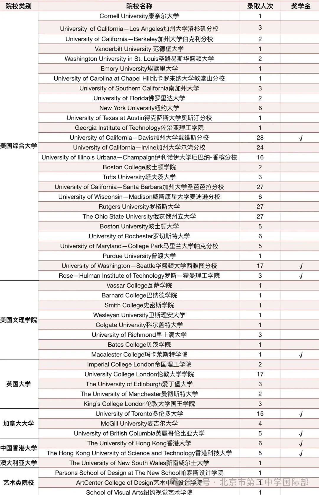 近几年,录取院校呈现多元化,每年都有超过半数的学生被世界知名大学录取,包括美国耶鲁大学、哥伦比亚大学、杜克大学、约翰·霍普金斯大学、芝加哥大学、康奈尔大学、加州大学伯克利分校、加州大学洛杉矶分校、密歇根大学安娜堡分校、卡内基梅隆大学、圣路易斯华盛顿大学、南加州大学,英国剑桥大学、牛津大学、帝国理工大学、伦敦政治经济学院、伦敦大学学院,加拿大多伦多大学,新加坡国立大学、南洋理工大学,日本东京大学,中国香港大学等顶级院校。艺术类录取院校包括罗德岛设计学院、帕森斯设计学院、芝加哥艺术学院、伦敦艺术大学、伯克利音乐学院等。