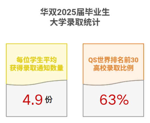 截至2025年5月26日,华双2025 届毕业生人均获得4.9份大学录取,63%的学生获得QS世界排名前30名高校录取。