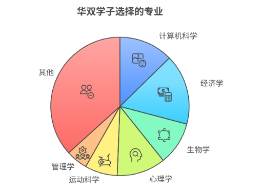 在专业选择上,华双2025届学生继续呈现多元化的趋势。除了经济学、计算机科学、心理学,学生还对系统工程和设计、政治学、传播设计、插画、动画、传播与媒体研究、社会学、物理、生物、数学、运动科学、营养学、管理学、人力资源管理、公共健康科学、生命科学、运筹学、统计学等专业感兴趣。