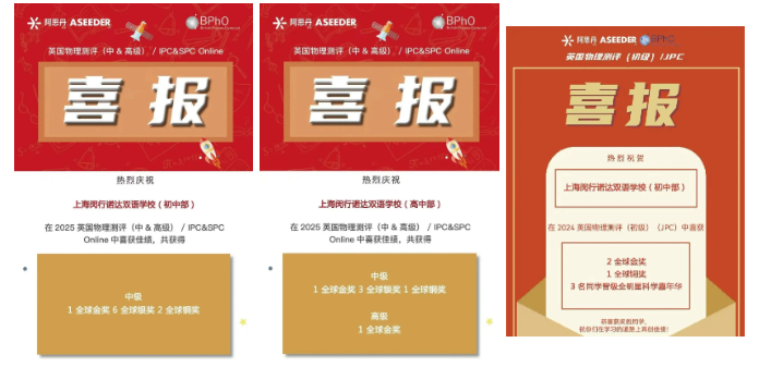 在JPC物理竞赛中,中学部共收获2个全球金奖,1个全球铜奖,3人晋级全明星科学嘉年华;IPC方面,NACIS学子共斩获包含1个高级全球金奖、2个中级全球金奖在内总共15个奖项,展现了NACIS在物理方面的竞赛实力。