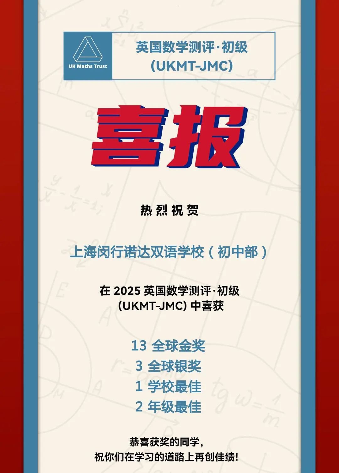 在英国数学测评中,NACIS 6-7年级学生取得了优异的成绩,共获得13个全球金奖及3个全球银奖,其中还有1个学校最佳及2个年纪最佳。英国数学测评是国际高影响测评,NACIS提供理科土壤、资源和持续激励,让NACIS学子们都能找到挑战自我的路径。