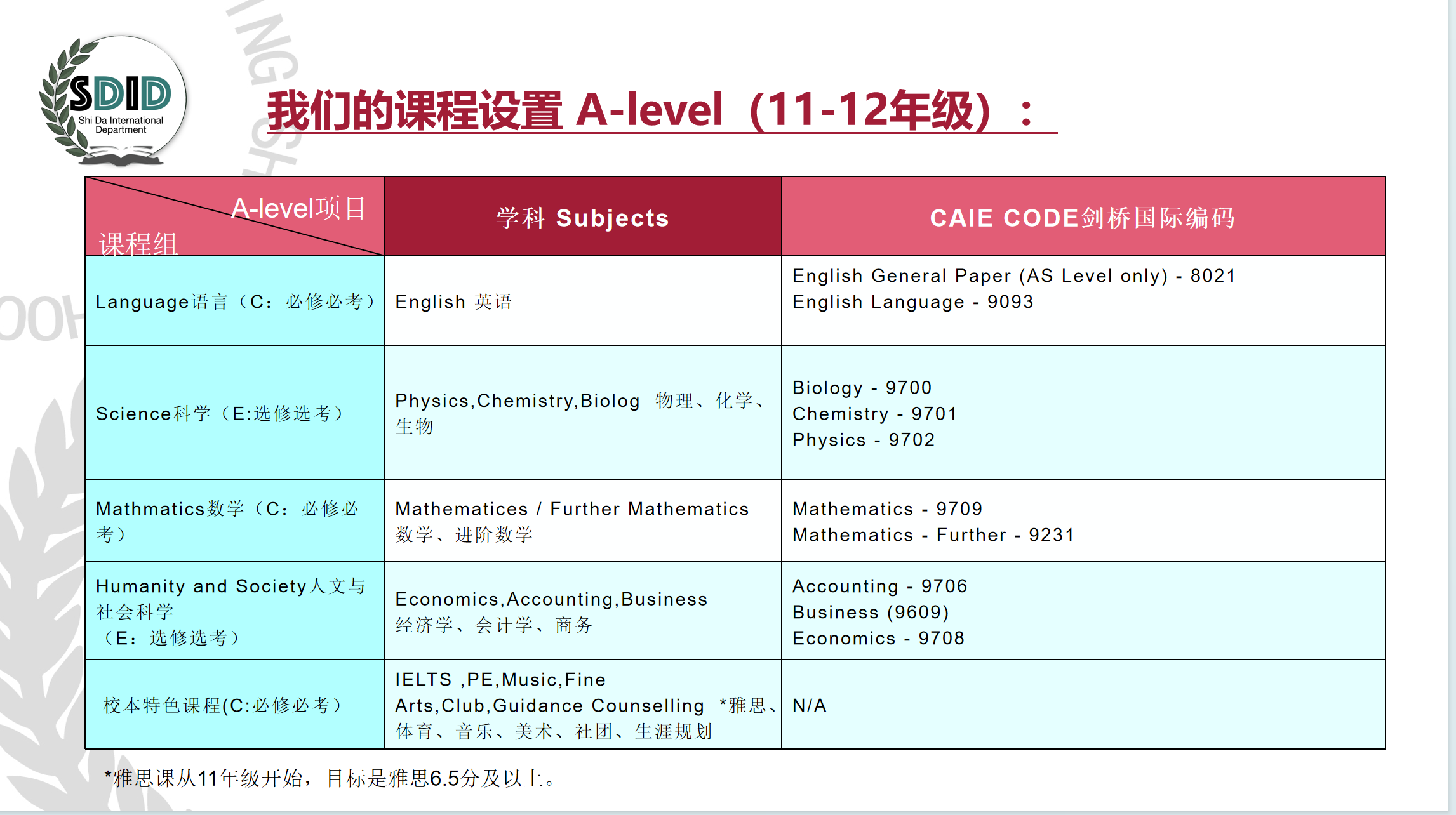 2019年师达国际部(Shi Da International Department)建立了“剑桥课程中心”和“剑桥考试中心”,为高中学生引进全英文授课的剑桥IGCSE和A-level课程,学生在完成高中必修课程的基础上,根据自身学习能力和需要在剑桥IGCSE和A-level课程中自主选择擅长的学科(数学、进阶数学、物理、商学、经济学等课程)进行学习,并在本校直接参加剑桥课程相关学科考试。通过剑桥大学国际考试委员会的考试,可获得“A-level”成绩证书,并凭该证书申请英、加、澳、美等英语国家的大学。