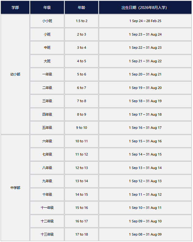 上海哈罗国际学校2026年入学年龄参照表