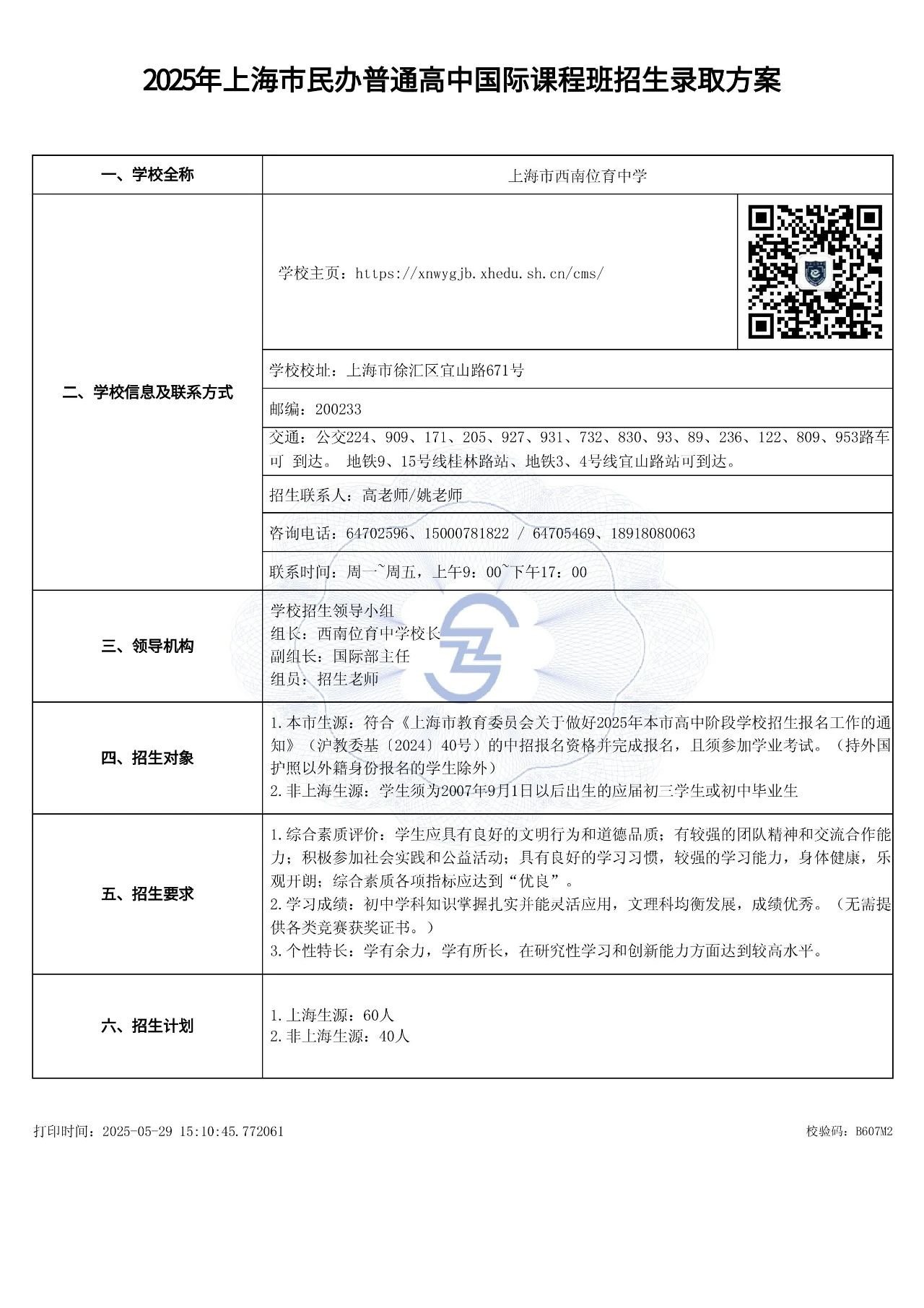 一、学校及联系方式 上海市西南位育中学 是2025年上海市民办普...