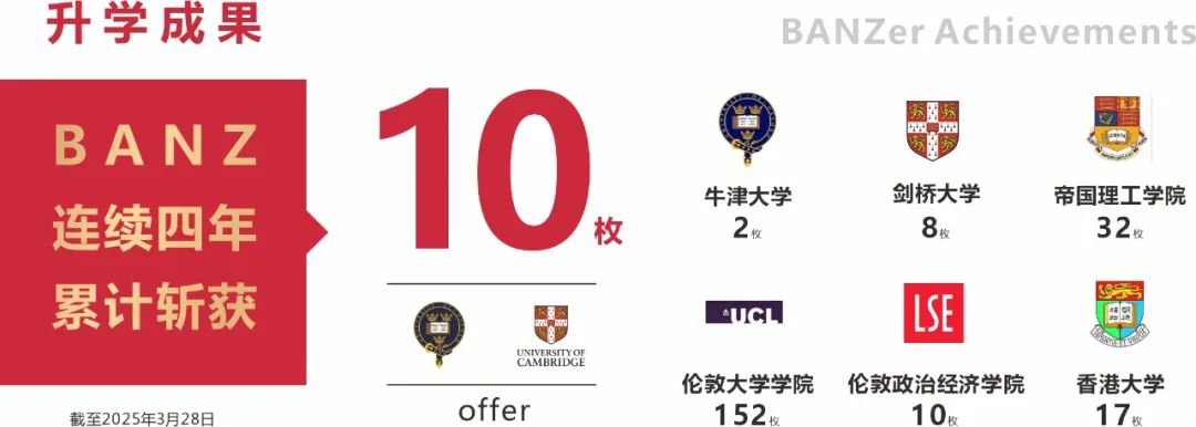 办学9年来,BANZ屡获佳绩,连续4届学子累计斩获2枚牛津大学、10枚剑桥大学正式录取,获得各方认可。
