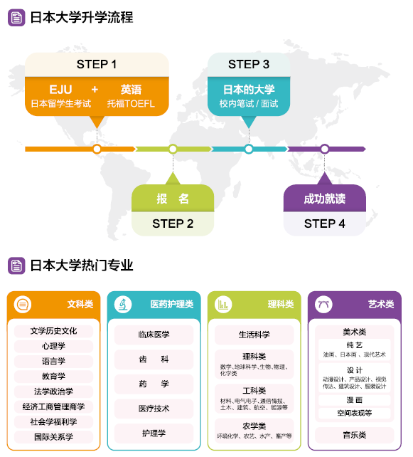 在国内读完高三课程后,参加日本留学生考试EJU,学生便可凭借美国高中毕业证书、托福成绩或日语等级证书和EJU成绩,申请日本相应大学。