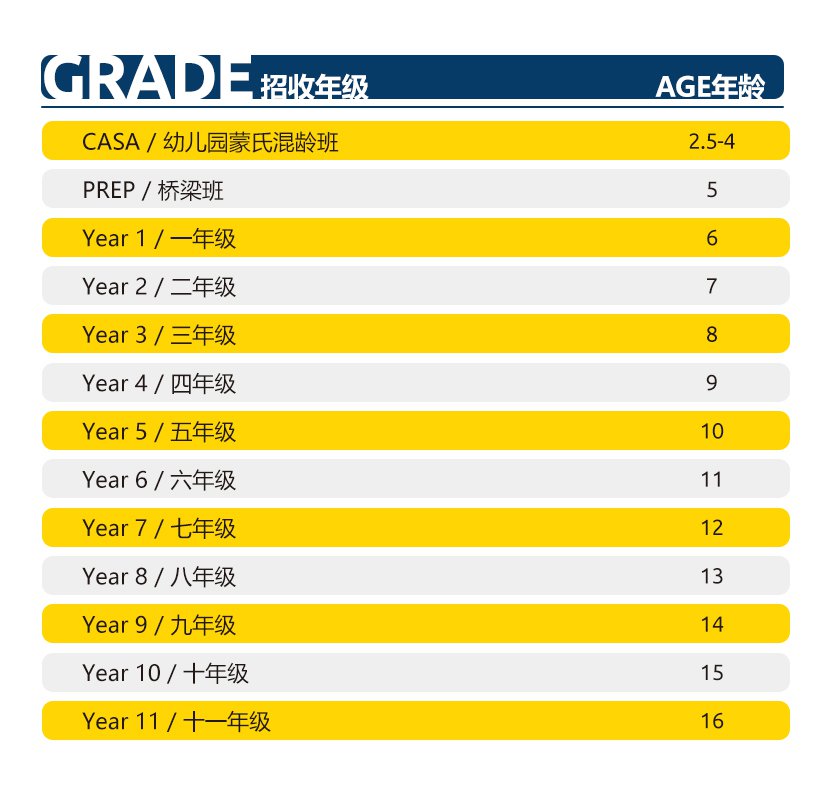 学年将从9月1日开始,直到6月底。学生将根据其年龄被安排到特定的年级,但其英语能力、之前的受教育经历、入学面谈结果也将作为学生入学年级的依据。我们将和家长讨论,以确定最适合孩子的年级。 招收年级如下: