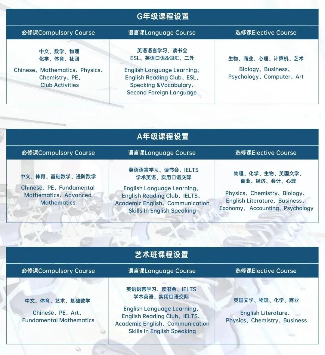 科目:数学、物理、化学、生物、商业、英语、中文、心理、美术、体育。