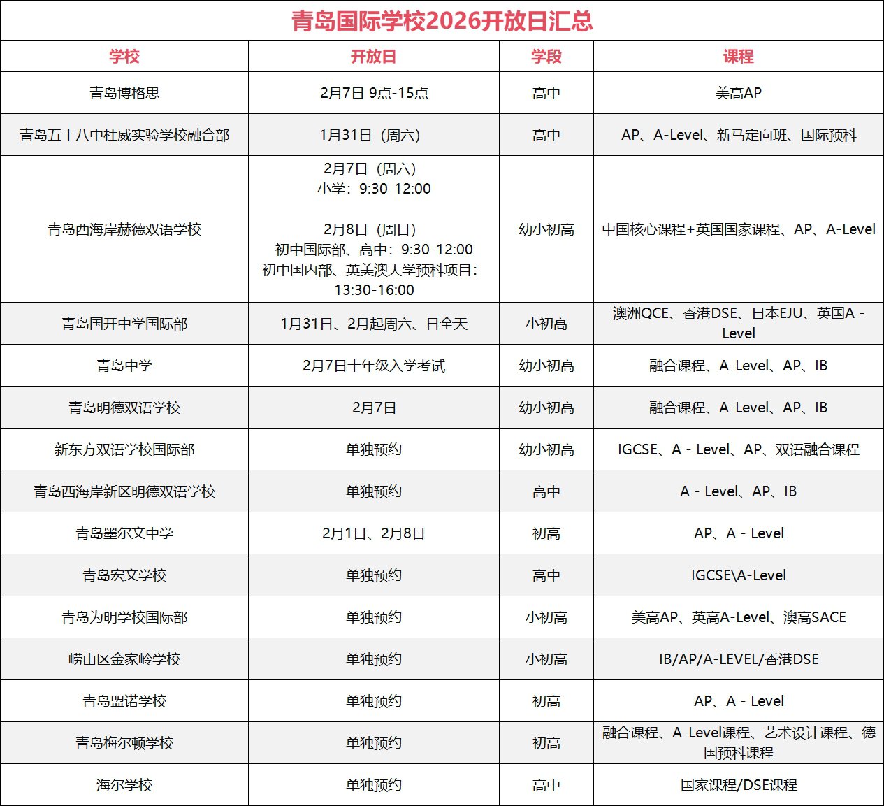 这里也给大家整理了一份青岛国际学校最新的开放日汇总信息表,有需要的家长赶紧收藏↓