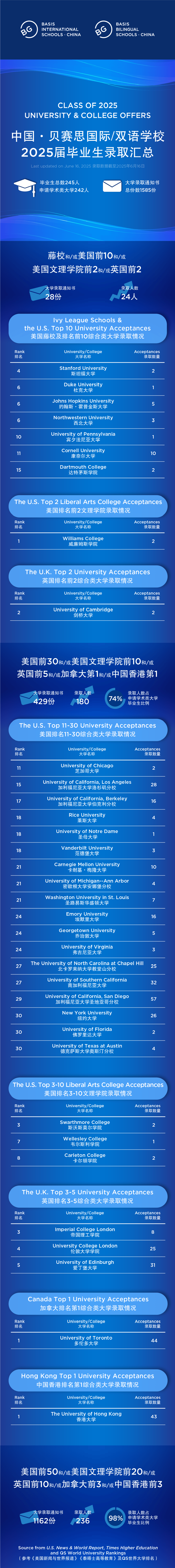 今年,深圳贝赛思国际学校的26名优秀毕业生共斩获170份大学录取通知书,并获得共894,056美元的奖学金。其中,23%(6人)获藤校和/或英国牛剑和/或美国排名前10的大学录取;88%(23人)收到美国排名前30和/或英国排名前2和/或加拿大排名第1和/或中国香港排名第1的院校录取;100%(26人)被美国排名前50和/或英国排名前5和/或中国香港排名第1的大学录取。