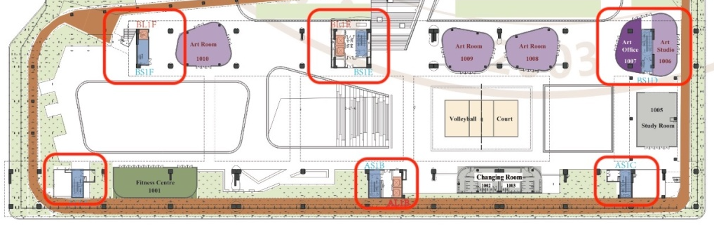 平台层共有2个电梯间和6个楼梯间通向考场楼层。除了中间的主电梯间和楼梯间,A、B栋东西两侧均分布有楼梯间。