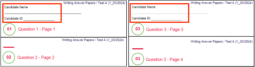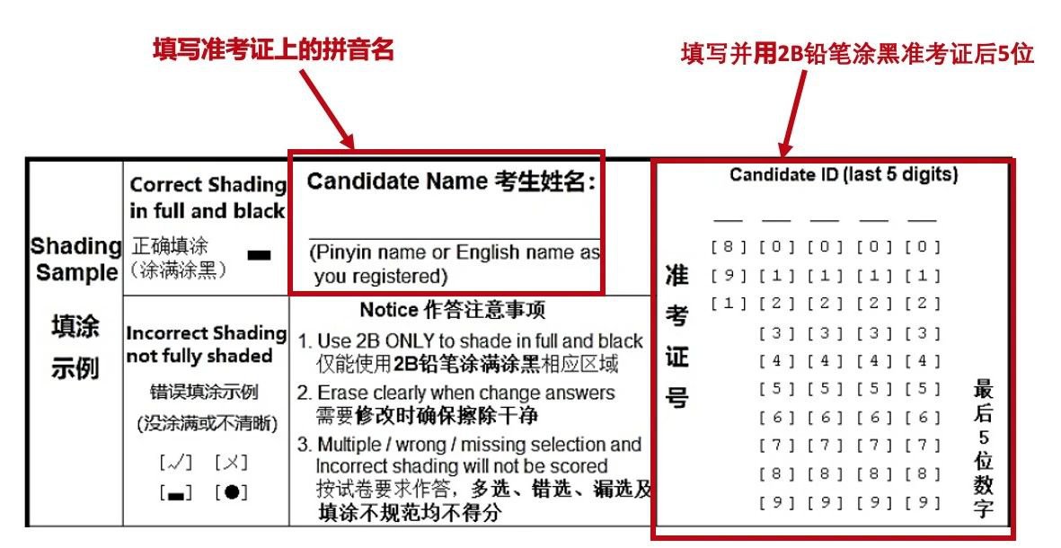 2. 英语考试的写作部分有2张共4面答题纸,第1面及第3面要求填写准考证上的拼音姓名和考号后5位,每一面左上角有写明题号和页码,如Question1-page 1,考生须按照页码顺序作答。