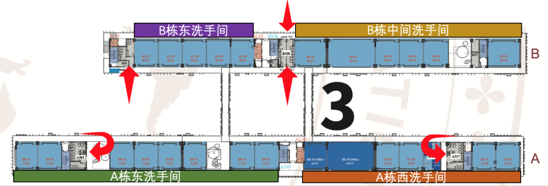 A栋洗手间分布在每层楼的东、西楼梯间附近。B栋洗手间在每层楼中间电梯厅旁(内外走廊均有入口)及西楼梯间附近。各层走廊均有指引,也可参考以下楼层平面图,了解洗手间的大概位置。