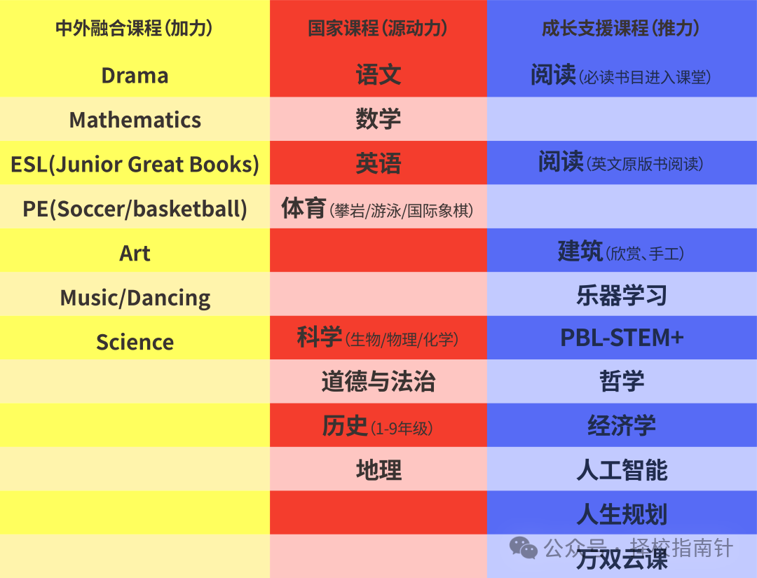 国家必修课程中的语文、历史、地理、政治,由中方教师采用世界先进的教学理念和方法进行整合和教学;