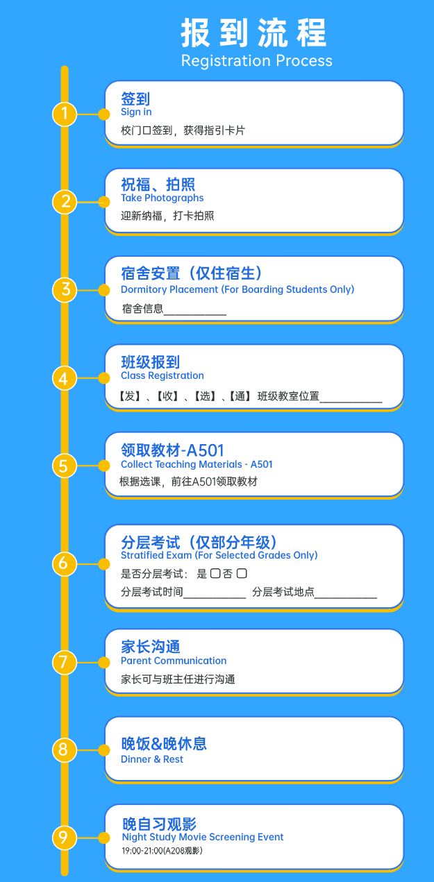 Sort out school supplies, full set of school uniforms, personal daily necessities in advance. Electronic devices must be used in strict accordance with the school's management regulations.