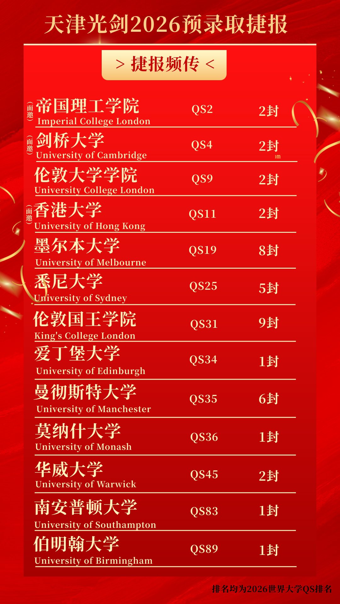 据统计,在2026年QS世界大学排名中,我校绝大多学子获取处于排名前25的全球顶尖梯队的录取offer:成功斩获伦敦大学学院、墨尔本大学、悉尼大学等全球知名顶尖学府的认可,并且收获2封剑桥大学、2封帝国理工学院、2封香港大学的面试邀请,以及获取麦克马斯特大学、西安大略大学10000加币奖学金,累计收到 39 份预录取通知及 6 份面试邀约。