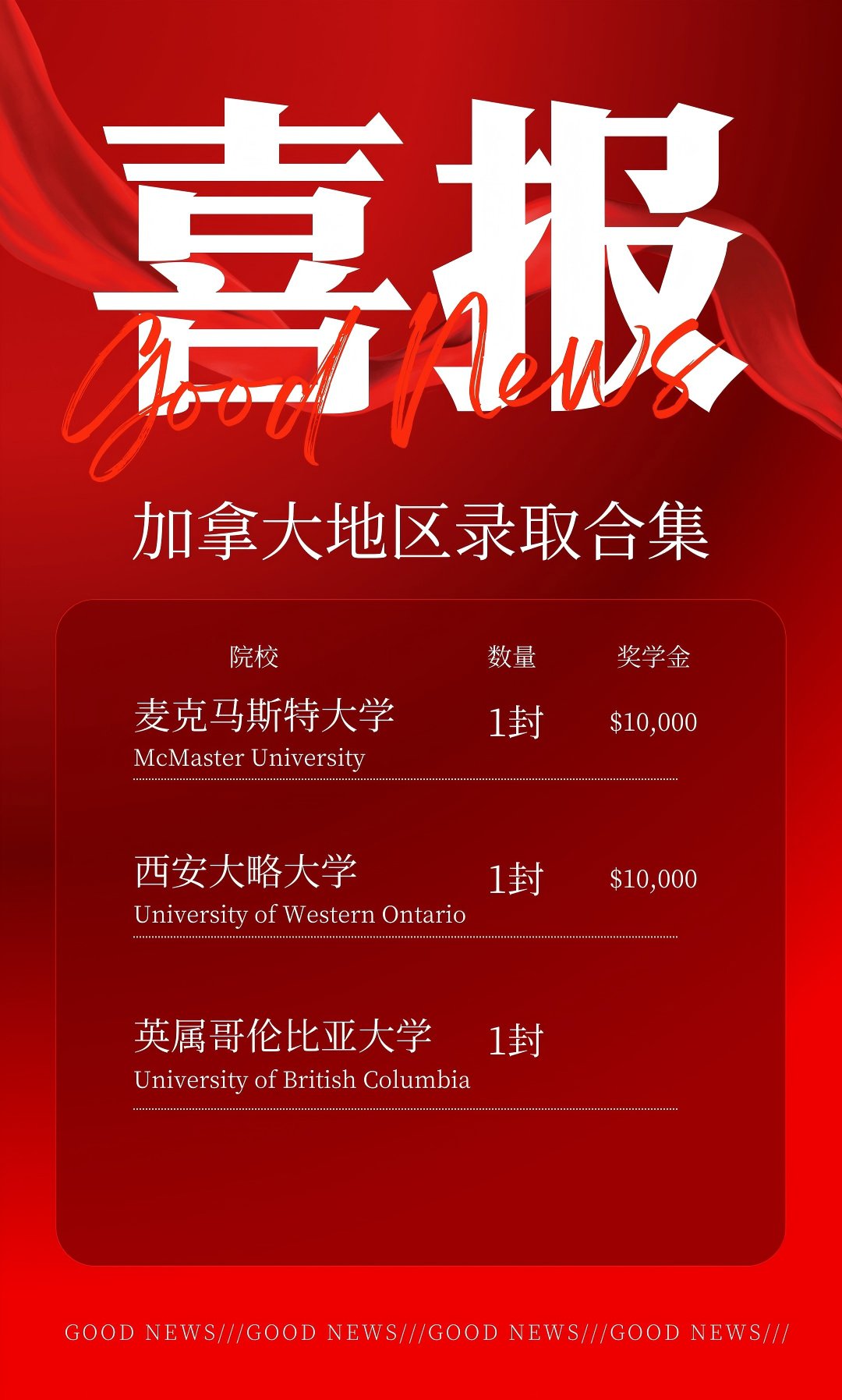 我校学子在国际升学赛道再获佳绩,多名同学成功斩获加拿大顶尖名校 —— 麦克马斯特大学、西安大略大学和英属哥伦比亚大学的录取通知书,更凭借优异的学术表现与综合素养,赢得麦克马斯特大学、西安大略大学每份 10000 加币的高额奖学金。
