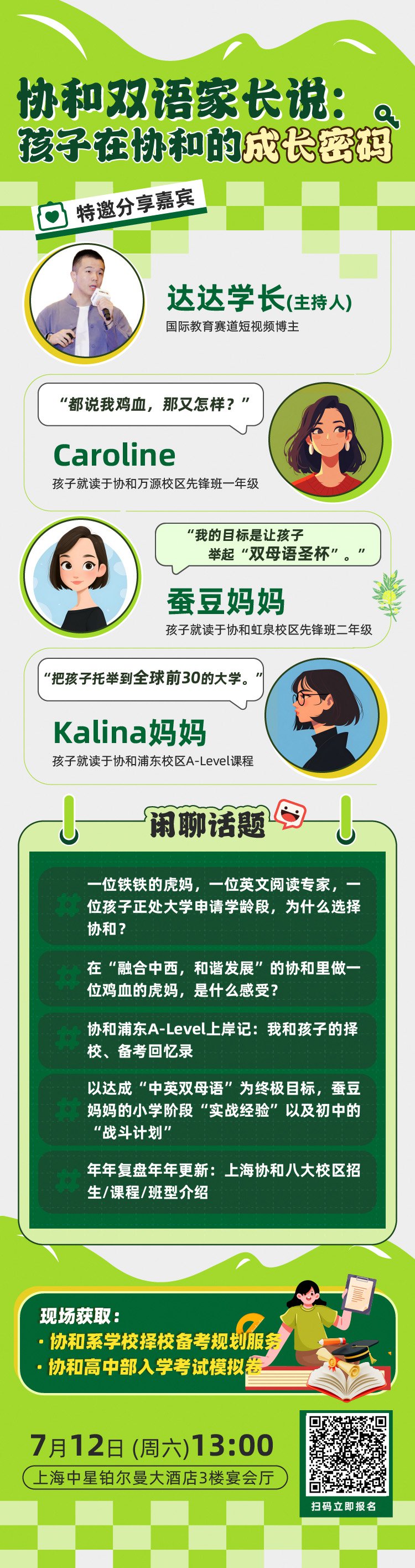 破圈不如先入圈,自学不如先取经,7月12日直面三位协和系在读生家长,涵盖低龄高龄段,听他们说说孩子们在协和学校中的成长密码。