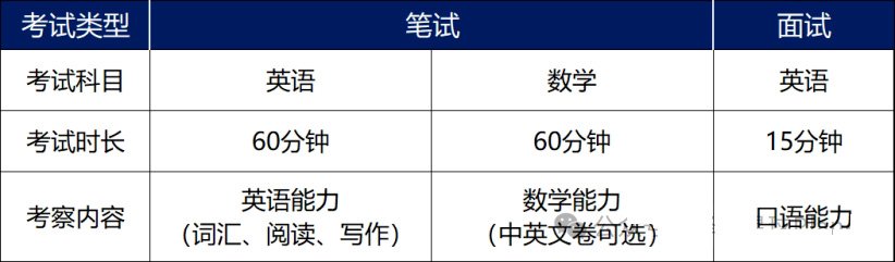 入学考试由英语(笔试)、数学(笔试)和面试三部分组成。