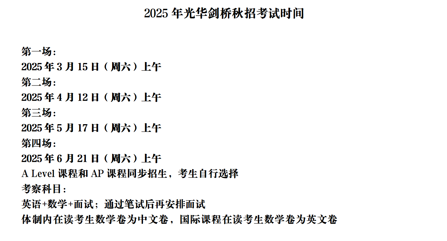 ✅ 关键提示:3月21日场次可报考二年制(AS/IBDP),4月场不提供二年制报考;考试科目为英语、数学、面试,新增科学思维考察,注重逻辑推导能力,数学涉及超前知识点,难度偏高。
