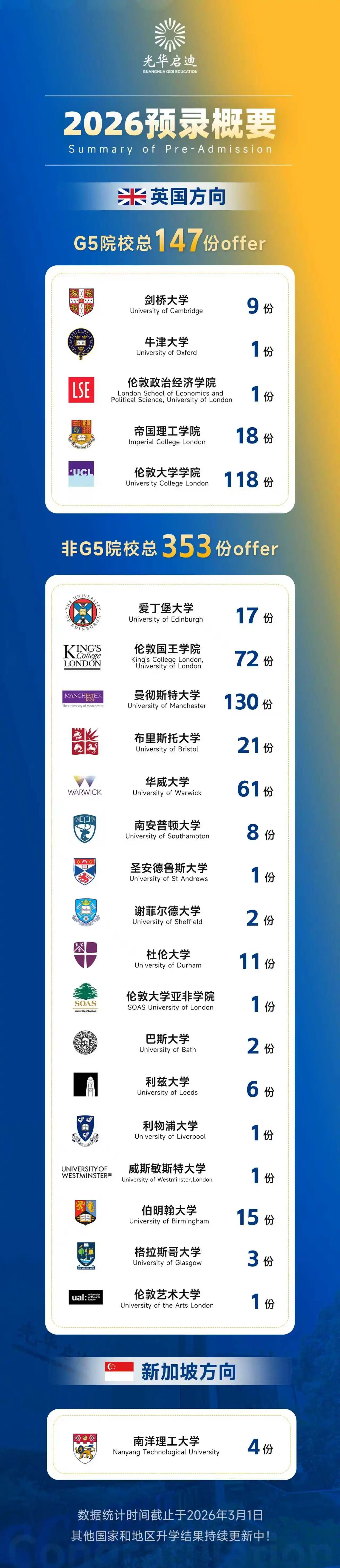 光华启迪 2026 届学子再创亮眼佳绩,在升学录取中表现突出。截至2026年3月1日,本届200余名毕业生共收获大学(预)录取通知504份,其中英国 G5 顶尖名校录取 147 份。录取详情可持续关注光华启迪官方微信公众号。